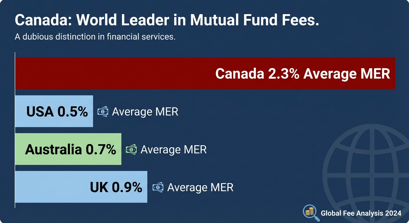 Canada has among the highest mutual fund fees in the world. The average Canadian mutual fund charges a Management Expense Ratio of around 2% to 2.5% per year. The global average is closer to 0.5%. This is not a coincidence. It is the predictable result of a system that was designed to pay your financial advisor, not to maximize your returns.