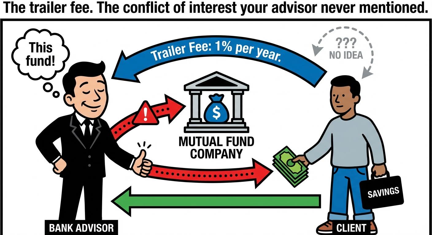 Inside that 2% to 2.5% MER is a fee most Canadians have never heard of: the trailer fee. It is typically around 1% of your balance per year, paid by the mutual fund company directly to the financial advisor who recommended the fund. Every year. As long as you hold it.
